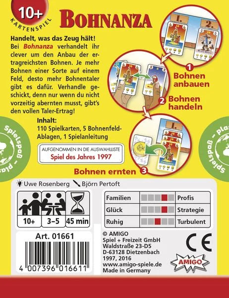 Handeln, was das Zeug hält! Bei Bohnanza wird clever um den Anbau der ertragreichsten Bohnen verhandelt. Je mehr Bohnen einer Sorte auf einem Feld, desto mehr Bohnentaler gibt es dafür. Da gilt es geschickt zu verhandeln, denn nur wer nicht vorzeitig abernten muss, erntet den vollen Taler-Ertrag! Das Handels-Kartenspiel mit Kultstatus von Erfolgsautor Uwe Rosenberg.